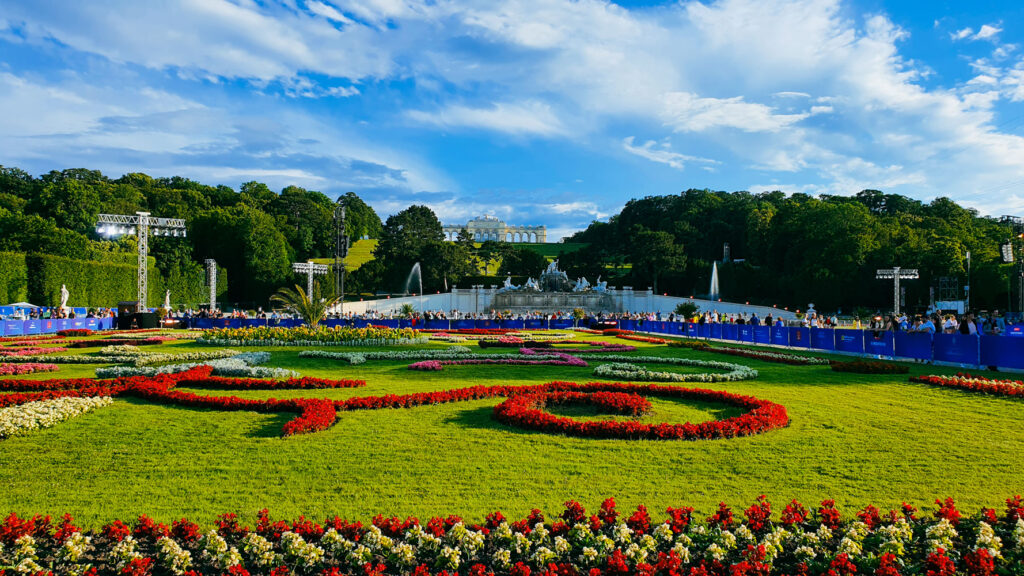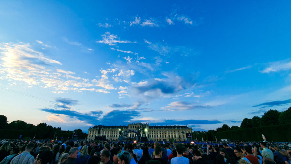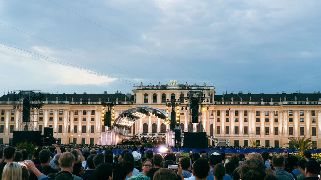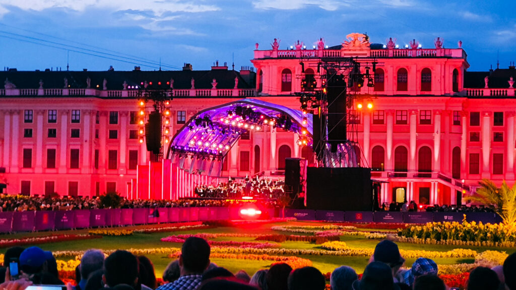 Είχε περάσει η ώρα της ξεκούρασης και είμασταν έτοιμοι να ζήσουμε την μεγαλύτερη εμπειρία του ταξιδιού και το κύριο έναυσμα για την επιλογή του ταξιδιού: τη Θερινή Νυχτερινή Συναυλία της Συμφωνικής της Βιέννης στο Παλάτι του Schönbrunn. Η Θερινή Συναυλία αποτελεί ένα από τα σπουδαία στιγμιότυπα της Φιλαρμονικής χρονιάς με ορόσημο βέβαια για εκατομμύρια ανθρώπους σε ολόκληρο τον πλανήτη, την πρώτη μέρα του χρόνου. Μιας και οι πληροφορίες μας μιλούσαν για έγκαιρη προσέλευση στον χώρο, έτσι και ‘μεις φτάσαμε σχεδόν 3 ώρες πριν την έναρξη, ζώντας το παραμύθι των αυτοκρατόρων στο πάρκο του παλατιού που έχει ανακηρυχθεί Μνημείο Παγκόσμιας Κληρονομιάς από την UNESCO. Περπατώντας γύρω από το βάθρο της ορχήστρας βρήκαμε έναν χώρο για το κοινό στη μέση του μπαρόκ πάρκου έχοντας γύρω μας το εξαιρετικό σκηνικό του παλατιού και του Gloriette, που βρίσκεται στο ψηλότερο σημείο του πάρκου του παλατιού Schönbrunn και προσφέρει φανταστική θέα στη Βιέννη.
